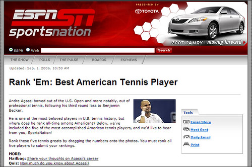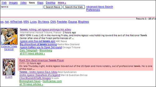 A funny thing happened today… I was searching Google News for tennis, wanting to read up on Andre Agassi’s amazing five-setter last night against Marco Baghdatis at the US Open.